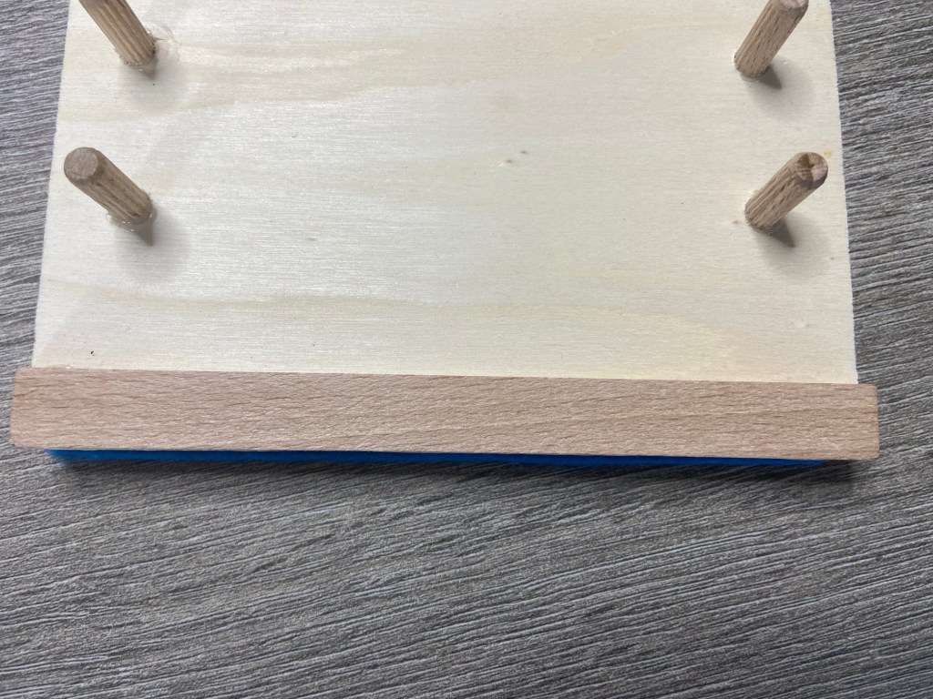 Zudem habe ich eine kleine Leiste gekauft, die ich auf die 14cm Breite gesägt habe und am unteren Ende der Platte mit Holzleim geklebt habe. Diese ist die Begrenzung für die Aufgabenblätter, dass die Blätter immer an der richtigen Position sind.