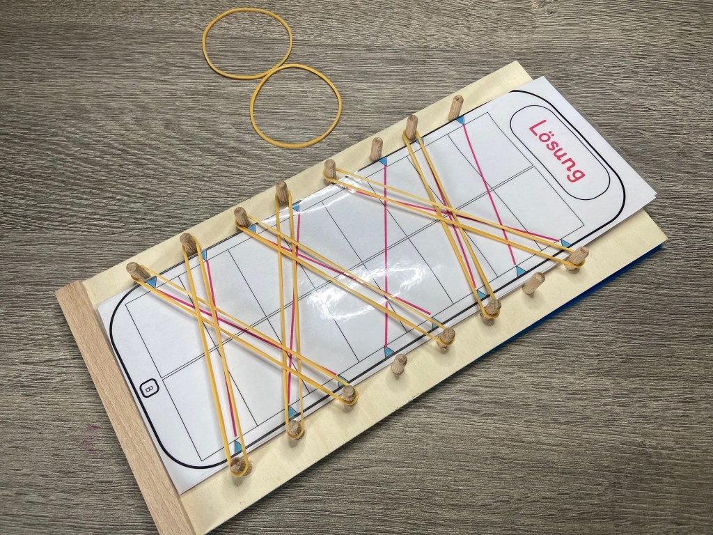 Wenn die Kinder die Gummis richtig gespannt haben und dann das Aufgabenblatt wenden sollten diese Linien Deckungsgleich mit den Gummis sein.