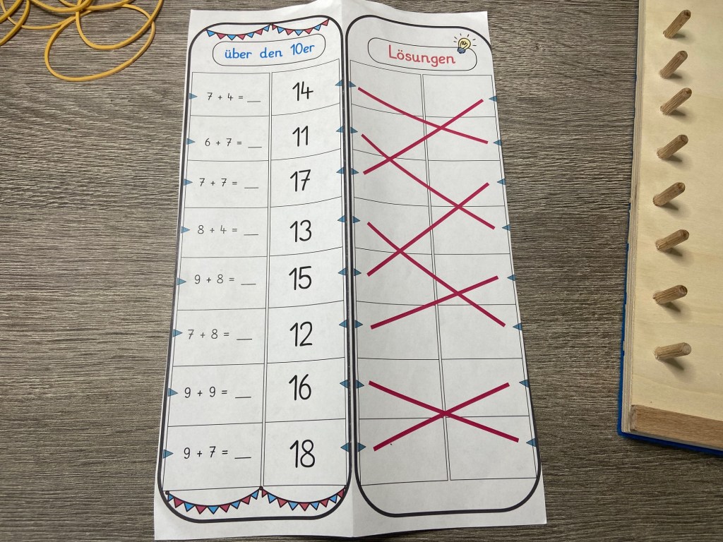 Die zweite Tabelle dient dann zur Selbstkontrolle für die Kinder. Hier ziehen wir dann dicke Linien von der Zelle mit der Aufgabe zur Zelle mit der richtigen Antwort.