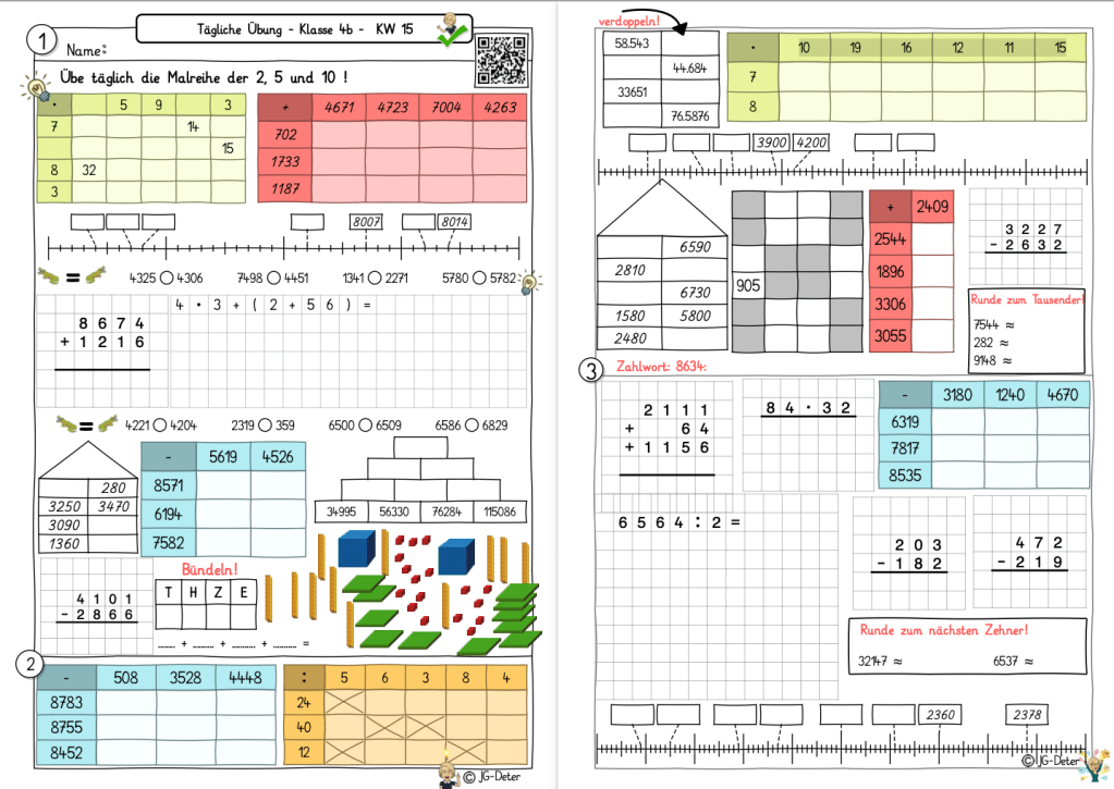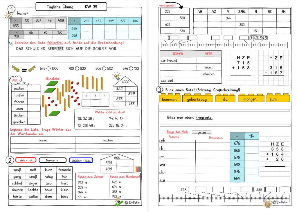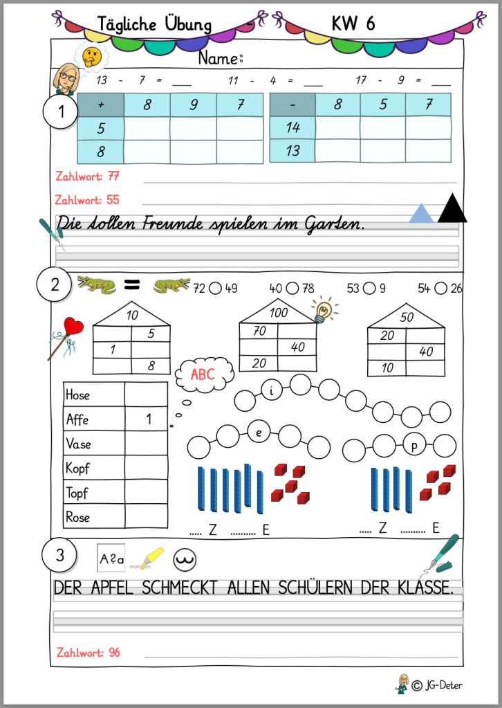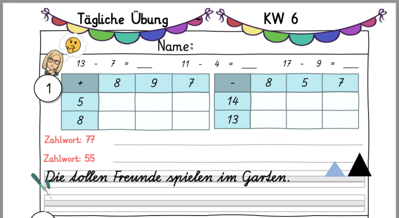Ein wichtiger Punkt! Meist sind ein bis zwei Aufgaben der täglichen Übung, Inhalte, die wir bereits hatten und die Kinder schon können. Die Aufgaben sind leicht zu bearbeiten. Somit bleiben diese Inhalte aber dauerhafter im Kopf der Kinder, als wenn man diese einmal im Unterricht behandelt hat und dann kaum mehr nutzt.