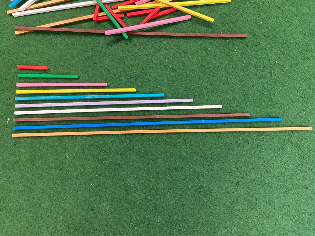 Im Mathe Unterricht können die Stangen vielfältig eingesetzt werden. Zuerst kann man die Stangen nach aufsteigender Länge hinlegen und mit den Kindern besprechen was Ihnen auffällt. Nun kann man beginnen einzelne Stangen zusammenzulegen. Die Kinder stellen schnell fest, dass zwei 5er Stangen eine 10er Stange ergeben.