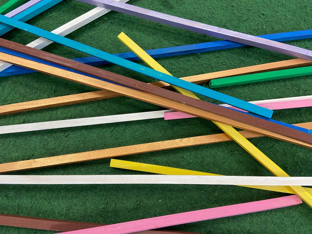Im Baumarkt habe ich kleine Vierkanthölzer gekauft. Die gibt es in verschiedenen Längen. Am besten berechnet Ihr vorab wie viel Stangen Ihr von jeder Größe braucht und berechnet so, wieviel Meter Stange insgesamt benötigt werden.