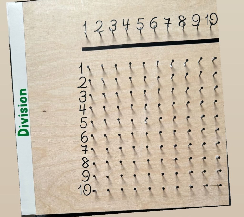 Auf dem Brett sind die Zahlen von 1 bis 10 sowohl horizontal als auch vertikal aufgedruckt. An den Schnittpunkten befinden sich kleine Nägel oder Stifte. So entsteht ein Raster, das zum aktiven Arbeiten mit Perlen, Gummibändern oder anderen Markierungen einlädt. Das Prinzip dahinter ist einfach: Oben steht der Dividend, seitlich der Divisor. An der Kreuzung lässt sich das Ergebnis – der Quotient – darstellen oder erarbeiten. Durch das gezielte Platzieren von Markierungen können Kinder nachvollziehen, wie oft eine Zahl in eine andere „hineinpasst“, und was gegebenenfalls als Rest übrig bleibt.