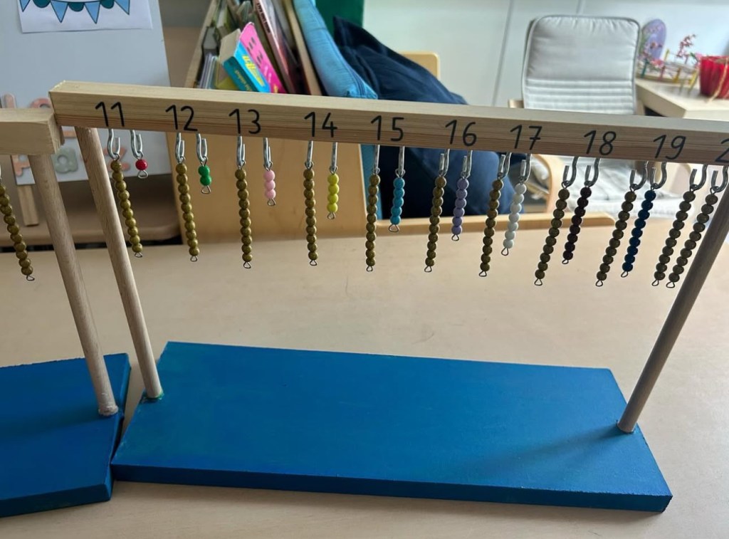 Auf dem Bild sieht man eine einfache, aber äußerst wirkungsvolle Konstruktion: An einem Holzgestell hängen Perlenstäbe, sortiert von 11 bis 20. Jeder Perlenstab setzt sich dabei aus einem goldenen Zehnerstab und einer farbigen Einer-Perlenkette zusammen. Diese klare visuelle Trennung hilft den Kindern, zweistellige Zahlen in ihre Bestandteile zu zerlegen – ein entscheidender Schritt im Aufbau des Stellenwertverständnisses.