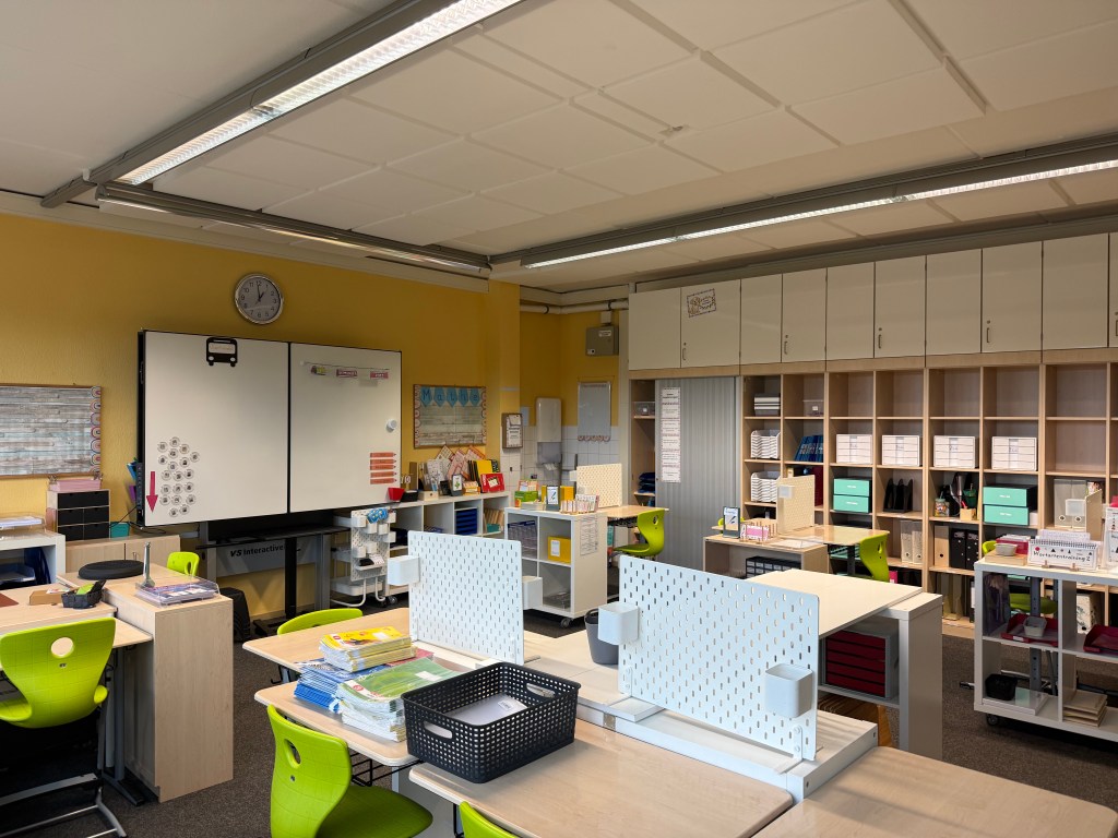 Mein neuer Klassenraum ist nur etwa 50 m² groß – und damit ziemlich eng. Trotzdem habe ich versucht, ihn so zu gestalten, dass die Kinder verschiedene Lern- und Arbeitsmöglichkeiten haben.
