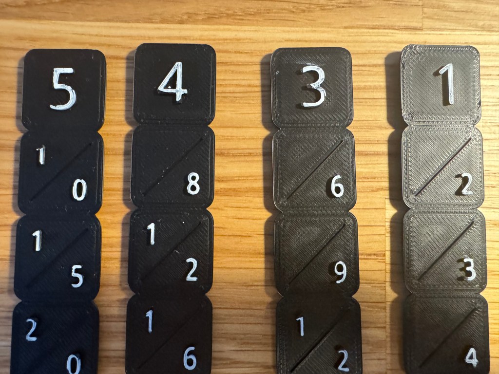 Ich habe die Stäbe in zwei Druckversionen getestet, um Lesbarkeit, Kontrast und Alltagstauglichkeit zu optimieren.
